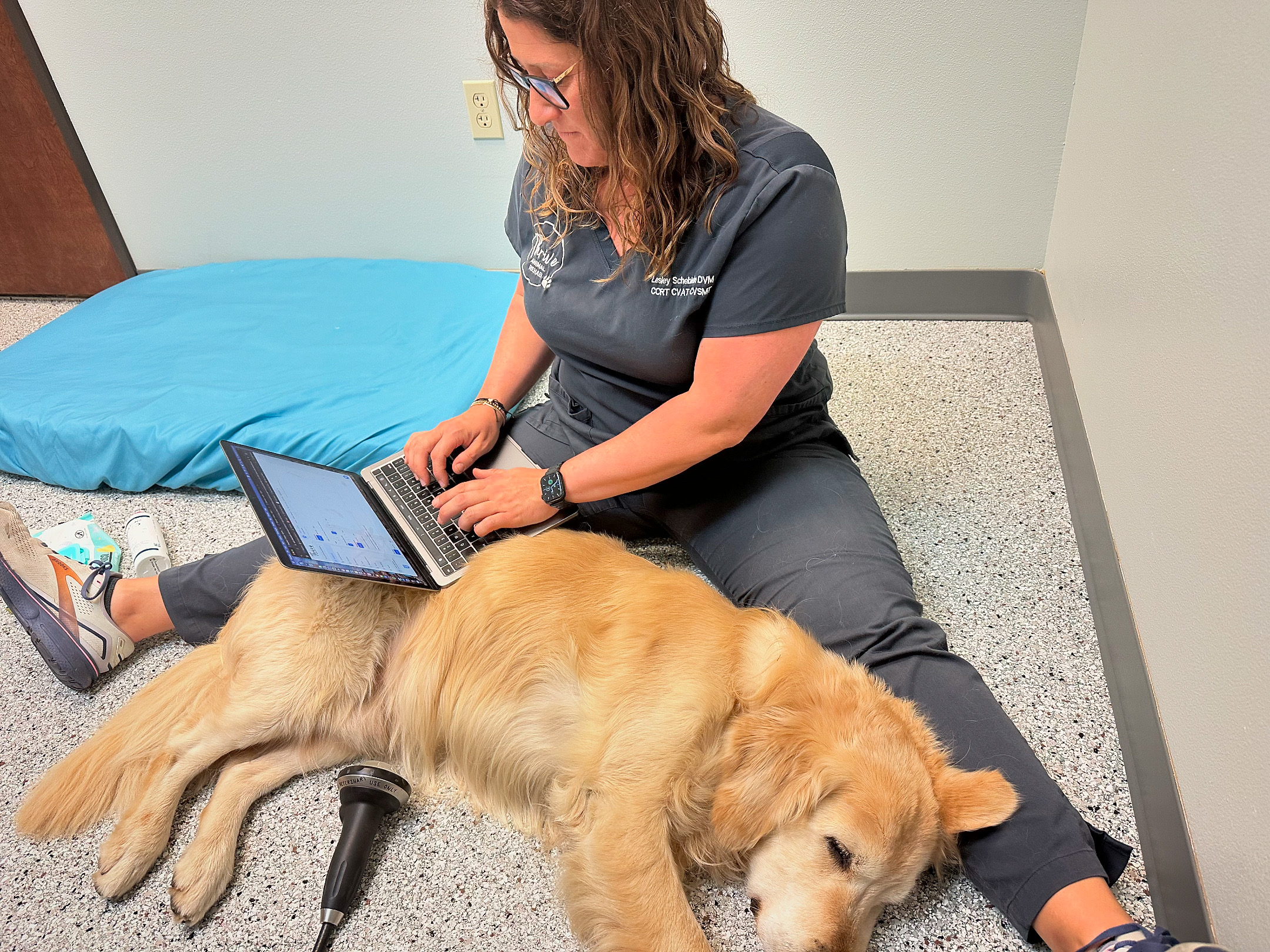 A handheld probe is held against the treatment area for an average of 5 minutes per site. You will hear an audible click as we deliver the “waves” directly to the targeted joint, ligament or sore muscle. It can be somewhat uncomfortable, especially on painful areas such as an arthritic joint – however, most dogs do just great!